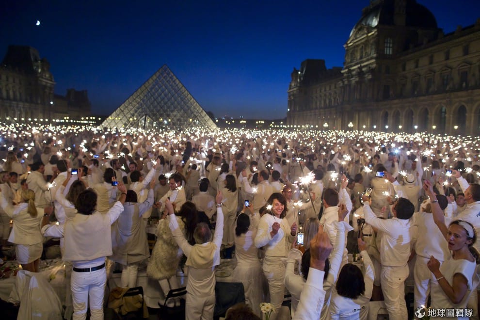 照片中是在羅浮宮前舉辦的世界性活動──「白色晚餐」(Diner En Blanc);因為活動是從「野餐」的概念而來,參與的民眾除了準備自己的菜色之外,也要穿著全白的服裝,餐具桌椅也必須是白色。