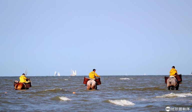 在比利時西南海岸的奧斯特敦刻爾克(Oostduinkerke),漁夫們騎著馬走入海中捕蝦。