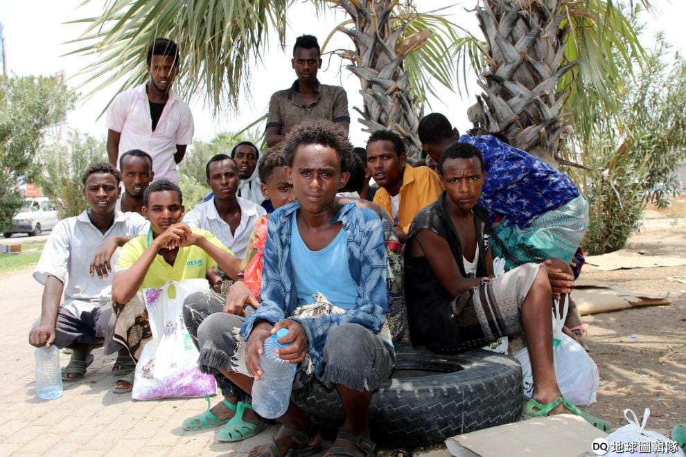在葉門的經濟中心亞丁市(Aden),來自衣索比亞的移民在大街上閒晃,他們希望可以借道葉門前往沙烏地阿拉伯追求更好的生活。