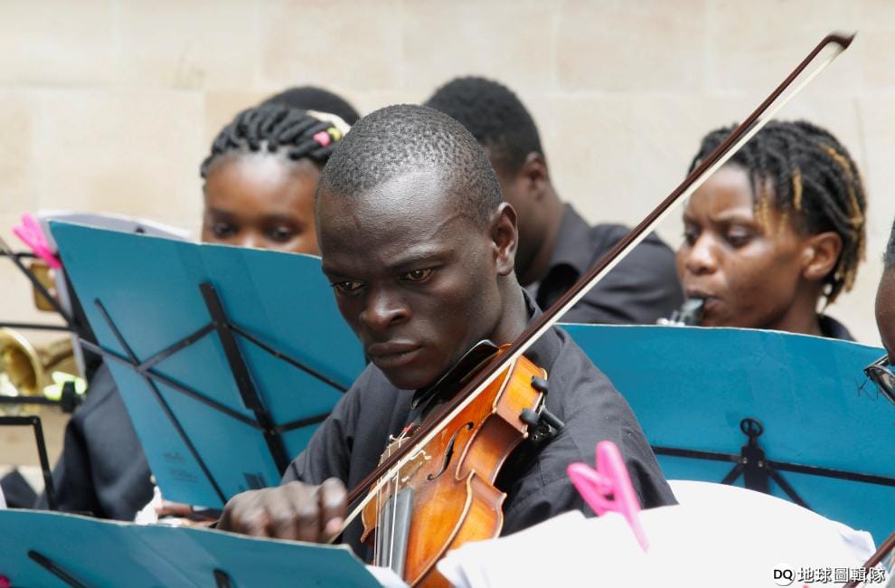 在首都奈洛比今年一月遭到恐攻的五星級都喜觀光酒店(DusitD2 Hotel),來自街頭古典交響樂團的成員正在用悠揚的樂音慶祝飯店重新開幕。