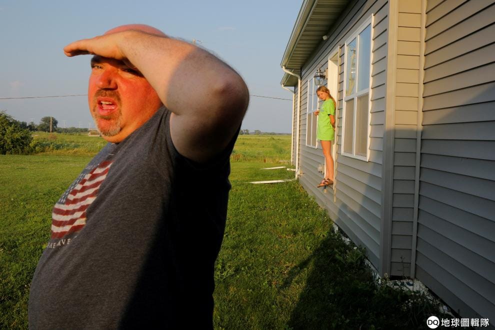 在威斯康辛州拉辛縣的芒特普萊森特村(Mt. Pleasant),村民馬霍尼(Jim Mahoney)看向正在大興土木的富士康工廠,他拒絕將土地和房舍賣給富士康。