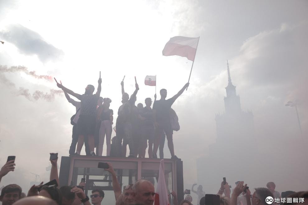 在首都華沙的大街上,民眾高舉波蘭旗幟,紀念華沙起義(Warsaw Uprising)滿 75周年。