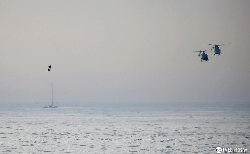 法國發明家薩帕塔(Franky Zapata)站在他發明的飛板(Flyboar)上,準備登陸英國城市多佛(Dover)。
