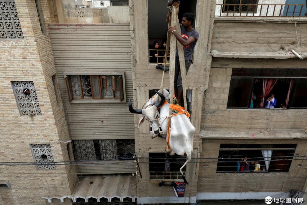 人們用起重機,小心地把用來獻祭的牛隻從屋頂降下,替即將到來的古爾邦節(Eid al-Adha)做好準備。