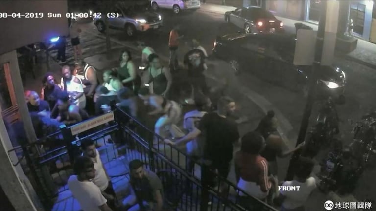 透過俄亥俄州代頓市(Dayton)的監視攝影機,記錄下槍手貝茲(Connor Betts)進入酒吧無差別攻擊後,人們跑出酒吧、觀望外頭情勢的模樣。