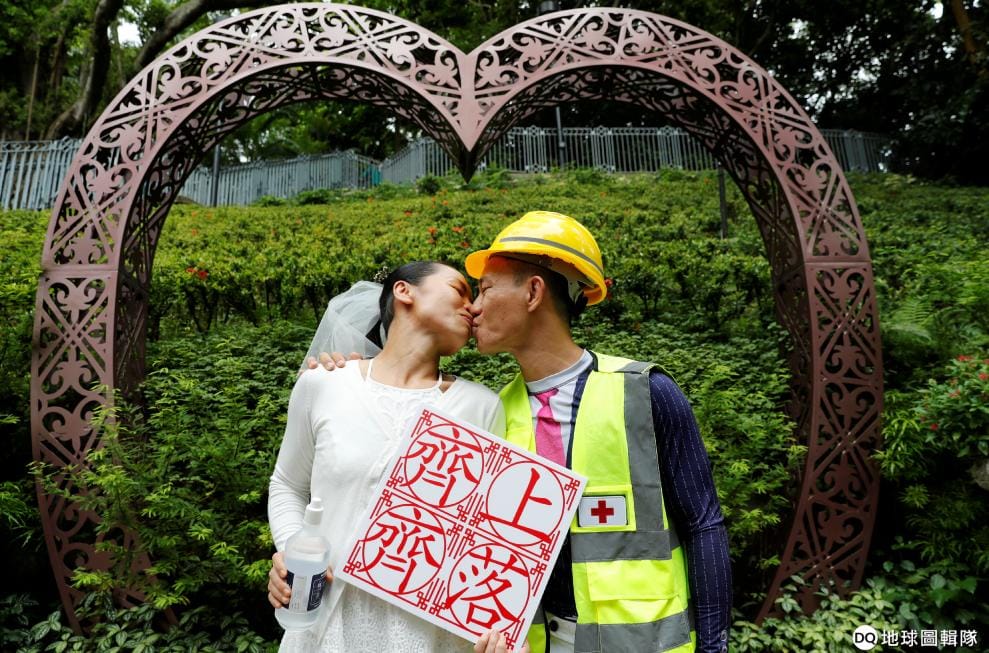 亨利(Henry Tong)頭戴安全帽、身穿醫療背心,和他的妻子伊萊恩(Elaine To)一同拍下婚紗照;伊萊恩手上則拿著用來阻止催淚瓦斯擴散時會使用的水瓶,種種細節讓這對新人「反送中」的訴求溢於言表。