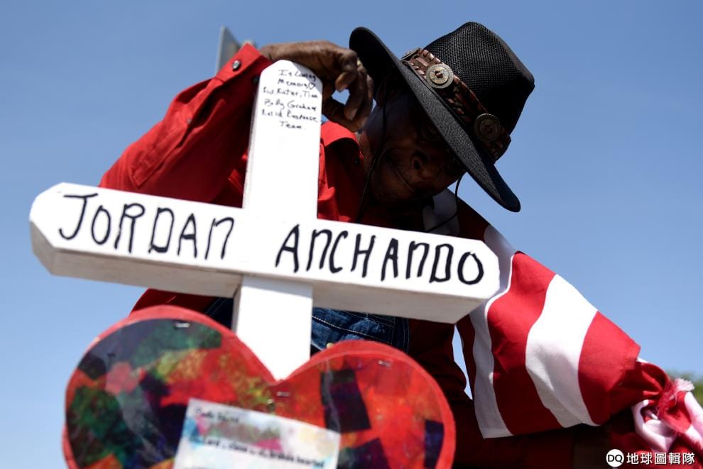 在德州艾爾帕索市(El Paso),樂利佛(Curtis Reliford)在寫有安納丘冬(Jordan Anchondo)的十字架旁下跪致意。這座不斷擴大的紀念區,全是為了悼念在槍案中逝去的性命。