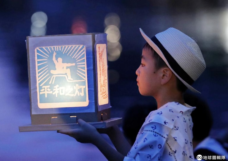 一名男童拿著紙燈籠,一同參與了廣島原子彈爆炸 74周年紀念儀式。