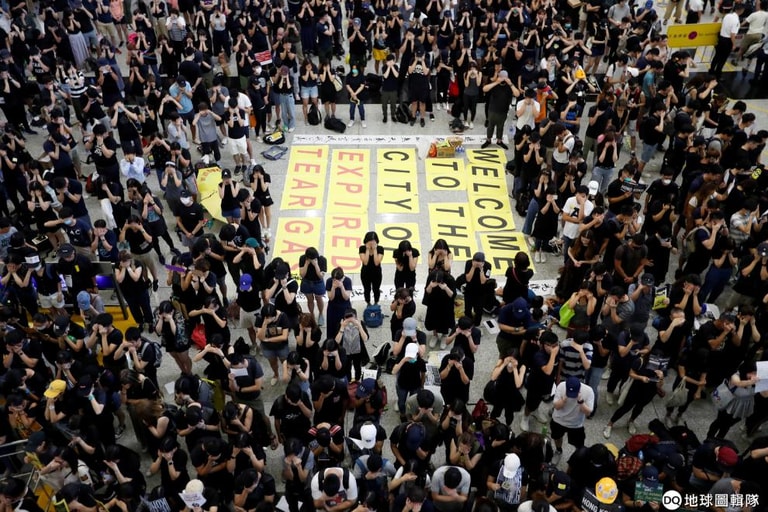 反送中的香港民眾齊聚在機場的入境大廳抗議,希望可以把他們的訴求傳達給來往於此的旅客。畫面中鮮黃色的字卡寫著「歡迎來到過期催淚瓦斯之城」,抗議警察會朝示威民眾發射過期的催淚瓦斯。
