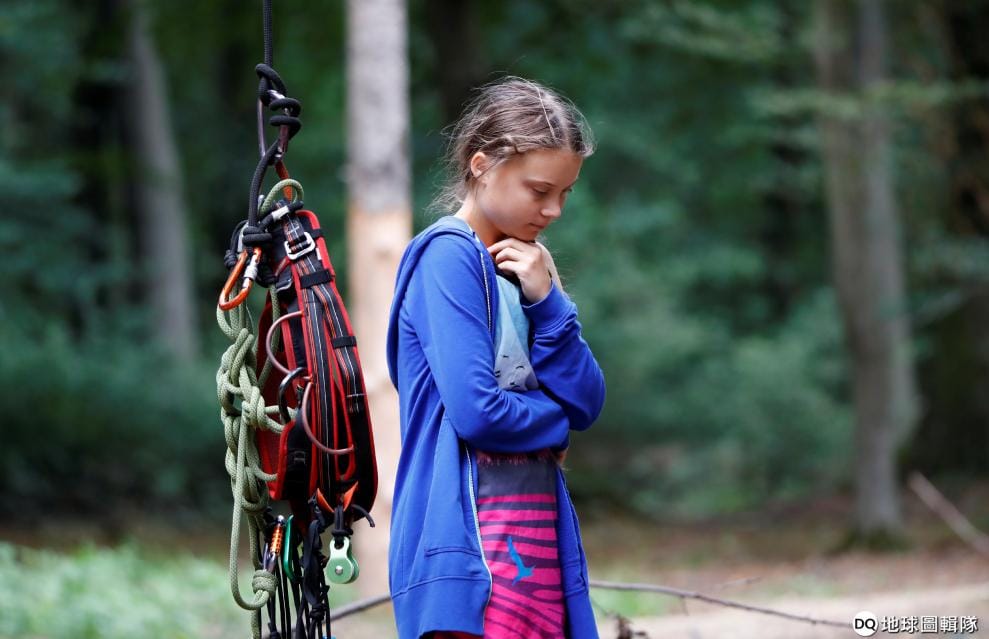 瑞典氣候變遷環保鬥士桑柏格(Greta Thunberg)來到預定要配合露天褐礦場砍除的森林,低頭沈思著。