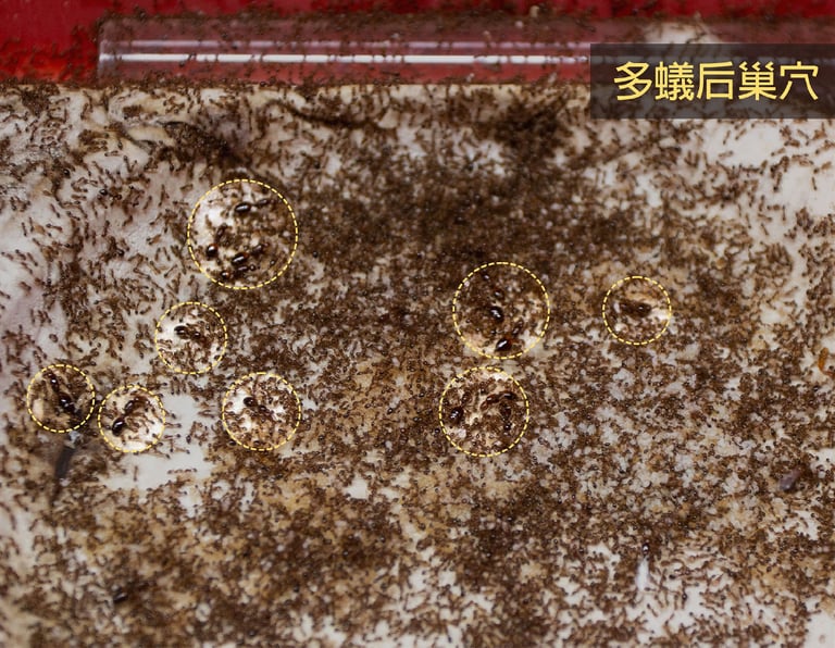 但在多蟻后巢,可能蟻后比較多,工蟻不會留給每隻蟻后空間,蟻后就跟大家擠在一起生活,仔細觀察才能找到蟻后。