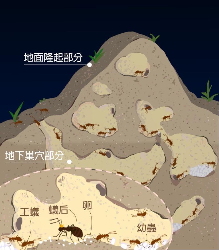 A:紅火蟻要成功交配,必須經歷一個「婚飛」的過程。在春、夏繁殖期,有翅的雄蟻與處女蟻后會飛到巢外交配,之後蟻后再找適合地點建立新巢。