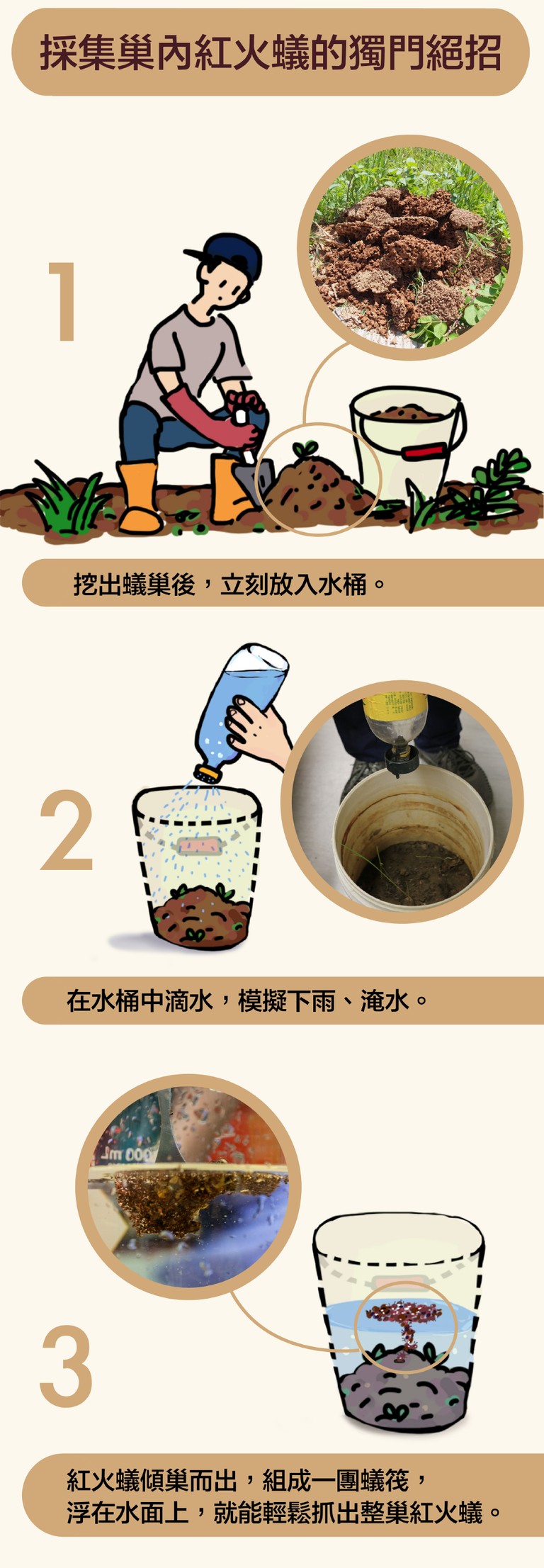 找到紅火蟻巢穴後,立刻用鏟子挖到水桶裡,動作必須迅雷不及掩耳,以免受到驚嚇的蟻后有機會逃跑。