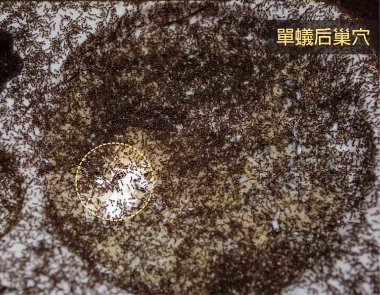 在單蟻后巢,工蟻會給唯一的蟻后多一點空間,所以蟻后的周圍會淨空一圈,很容易觀察到蟻后在哪裡。
