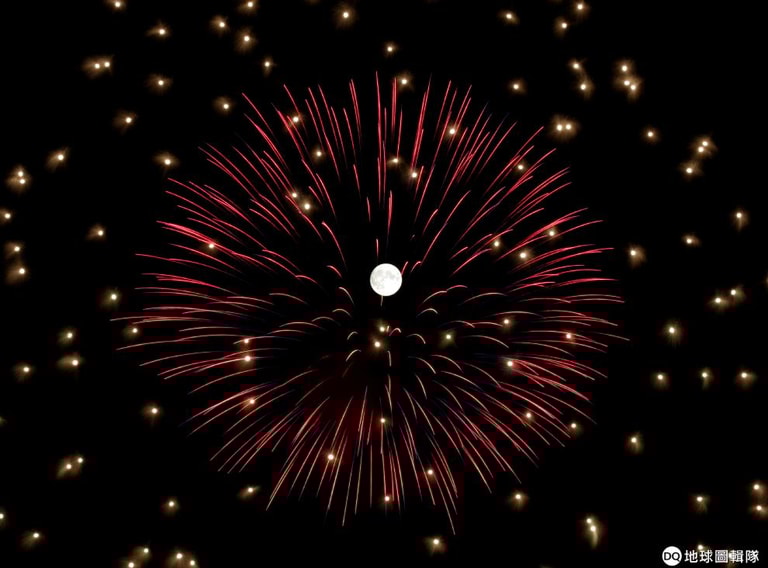 在聖母升天日(Assumption of Our Lady)的慶典上,煙火在夜空綻放,恰好與滿月相互輝映。