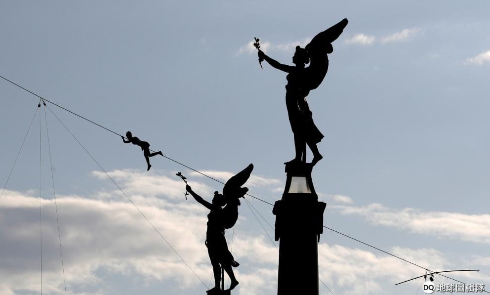 在兩座雕像之間,鋼絲好手邦戈恩加(Tatiana-Mosio Bongonga)在繩索上表演著,為國際馬戲節盛大開幕。