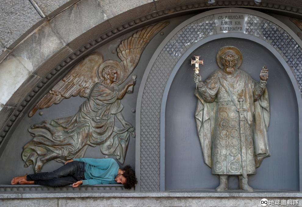 一名男子躺在政治家弗拉基米爾一世·斯維亞托斯拉維奇(Saint Volodymyr)的雕像旁休息。這是位於聶伯河(Dnipro River)河堤的系列浮雕之一。