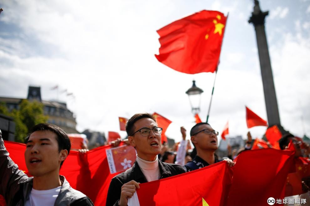 在倫敦特拉法加廣場,支持中國政府、反對香港示威者的民眾舉著五星旗抗議。