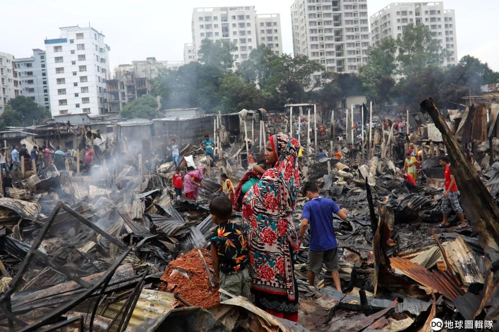 在首都達卡的一處貧民窟,無家可歸的民眾看著被大火燒毀的家園。16號晚間,當地發生大火,造成 1萬5,000間住宅被燒毀、至少 5萬人無家可歸,目前起火原因尚在調查中。