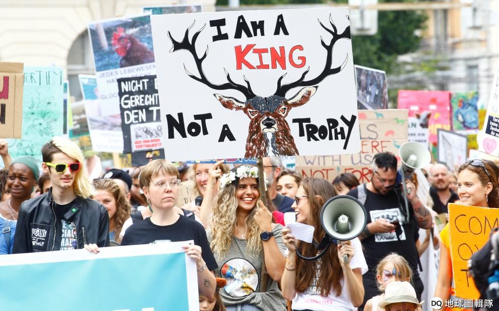 在蘇黎世街頭,參與 2019動物權利大遊行的民眾高舉海報抗議動物遭剝削,其中一張畫了公鹿的海報上寫到「我是王,不是戰利品」。