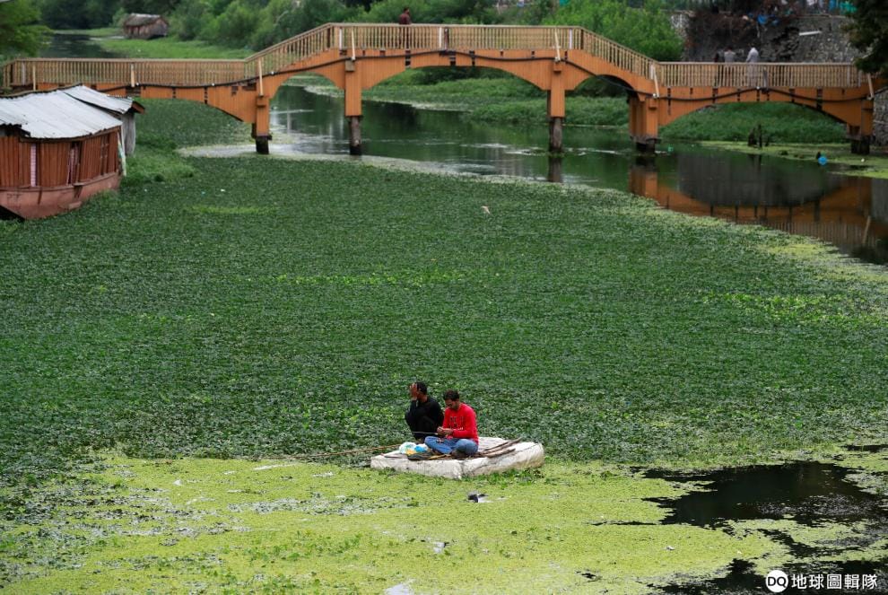 在查謨—喀什米爾邦的城市斯利那加(Srinagar),民眾乘著自製的小船在運河中釣魚。