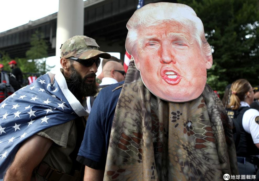 在奧勒岡州的波特蘭市(Portland),美國極右翼新法西斯組織「驕傲男孩」(Proud Boys)的成員正在遊行,其中一人揹著美國總統川普(Donald Trump)的頭像。