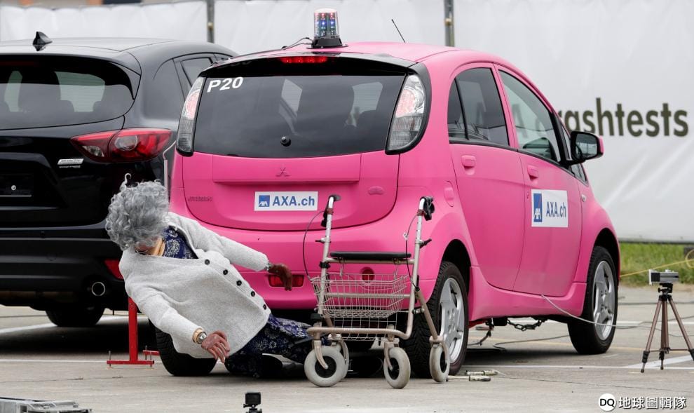 在瑞士東北部的迪本多夫(Duebendorf),三菱汽車正在進行電動車i-MiEV的撞擊測試,他們將測試人偶打扮成推著助行器的老太太。