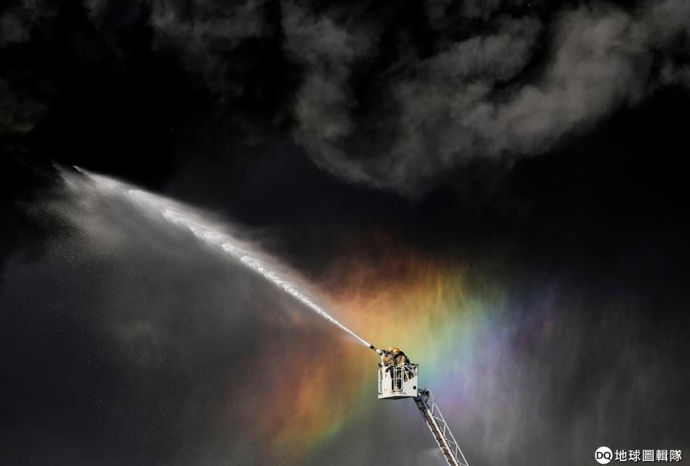 在聖彼得堡,消防隊員們搭乘雲梯忙著滅火,他們的身後則出現了濃密的煙霧和彩虹。