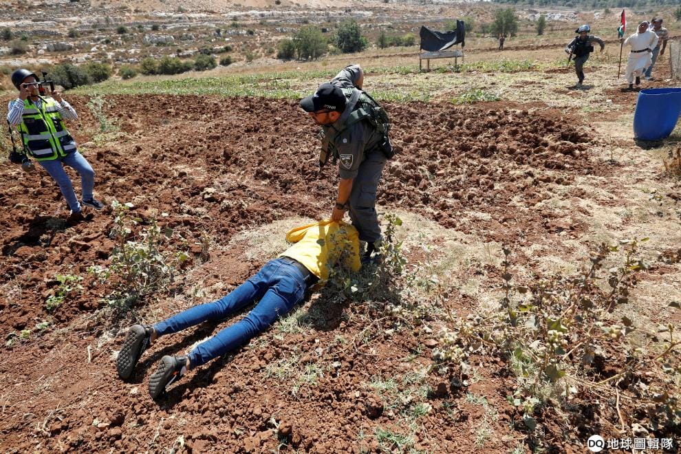 在被以色列佔領的約旦河西岸,一名巴勒斯坦抗議者被以色列邊界警察壓在地上,他為了聲援被以色列關押的巴勒斯坦囚犯來到邊界抗議。