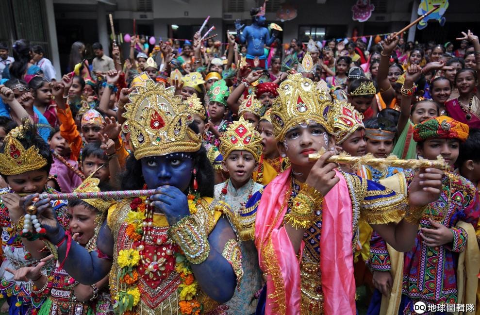 在印度第七大城艾哈邁達巴德(Ahmedabad)的一所學校內,學生們打扮成印度神祇黑天神(Krishna)的模樣,替膚色為藍色的黑天神慶生。
