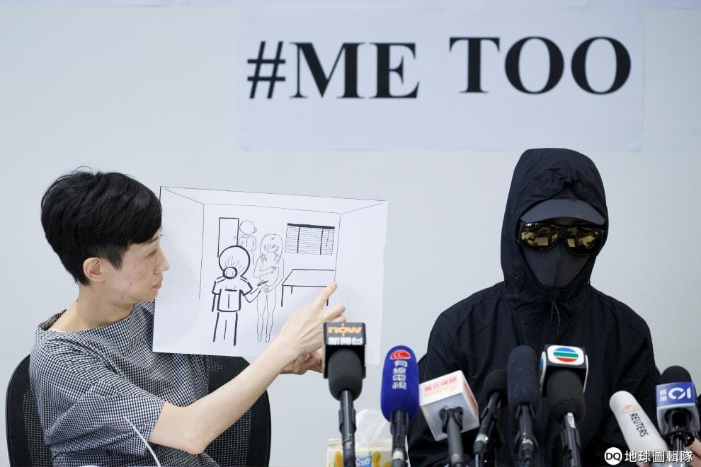 在公民黨立法會議員陳淑莊(左)的陪同下,參與反政府示威活動的呂姓女子出面表示,當她被警方帶回警局時,遭到了警方非法裸體搜身和凌辱,陳淑莊手上的素描還原了當時呂姓女子在警局被騷擾的狀況。