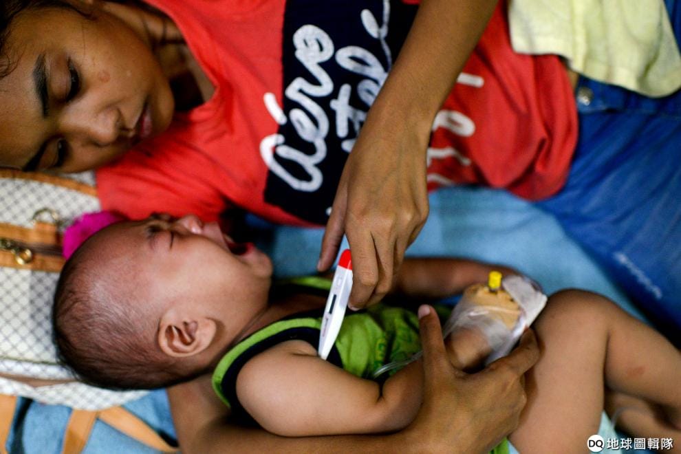 在馬尼拉的一間醫院內,一名母親正在幫染上登革熱的兒子量體溫。