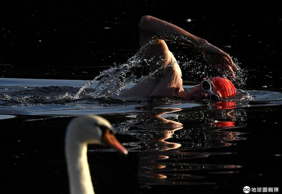 在倫敦海德公園內的蛇形湖(Serpentine lake),一名泳客游過湖旁的天鵝。
