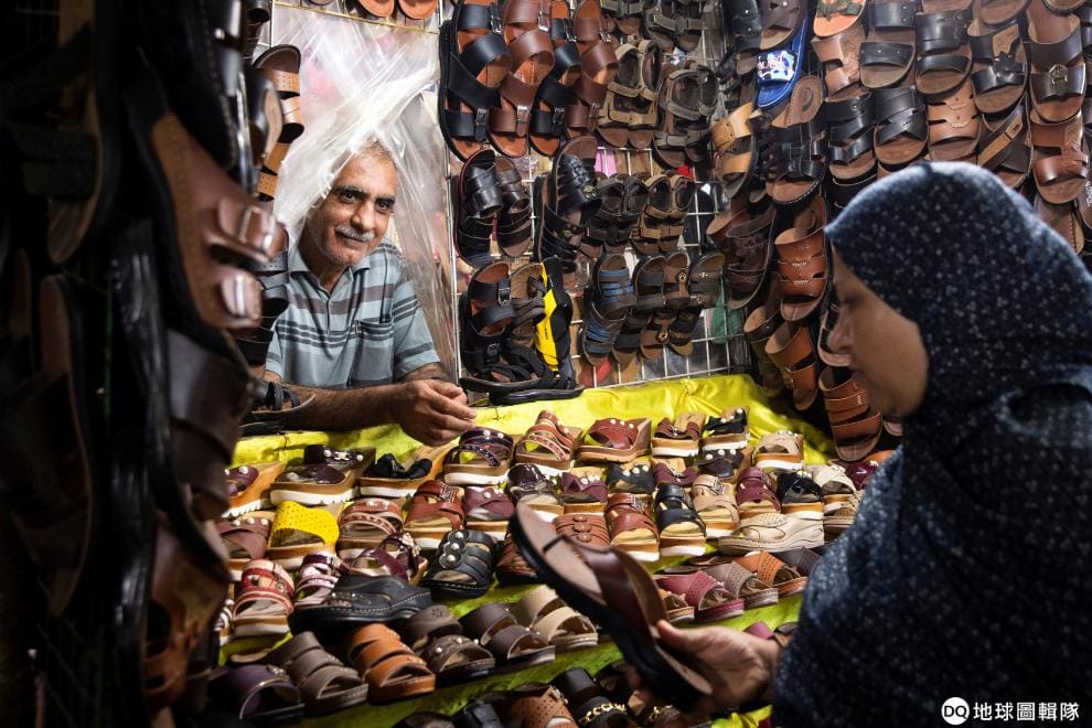 在波斯灣沿岸的阿巴斯港(Bandar Abbas),一名女子在市場中挑著拖鞋。