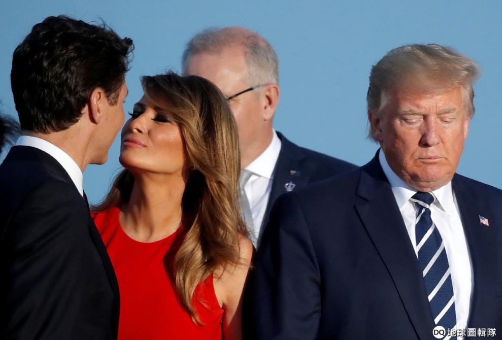 在比亞里茨(Biarritz)舉辦的G7元首高峰會上,與會成員準備拍攝大合照。期間,美國第一夫人梅蘭妮亞(Melania Trump)也和加拿大總理杜魯道(Justin Trudeau)互吻臉頰打招呼。
