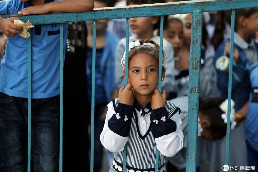 在加薩走廊南部的可汗優斯(Khan Younis),一名巴勒斯坦學生在由聯合國經營的學校裡迎接新學年的開始。