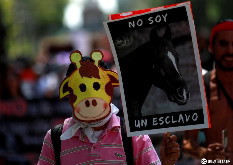 在墨西哥市街頭,一名戴著長頸鹿面具的民眾上街遊行,和動保人士一起抗議鬥牛活動和動物馬戲團,他手上的海報是一張馬的照片,上頭寫著「不是奴隸」。