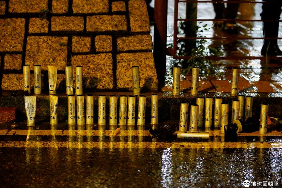 在香港新界西南荃灣區,鎮暴警察和反政府示威民眾發生衝突後,現場留下了滿滿的催淚瓦斯空罐。