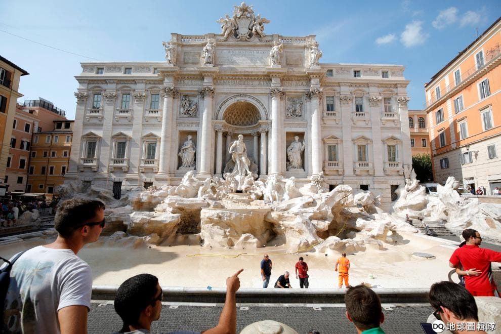 在羅馬著名的觀光景點特雷維噴泉(Trevi fountain),工作人員正在整修它。