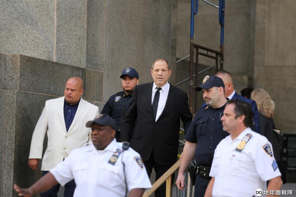 26號這天,被指控性侵女星和工作人員,引發好萊塢「#我也是」(#me too)運動的製作人韋恩斯坦(Harvey Weinstein,中)步出紐約州最高法院。對於檢方提出的性侵新指控,韋恩斯坦不認罪,相關修改將讓原訂於 9月9日舉行的庭審延到 2020年1月6日。