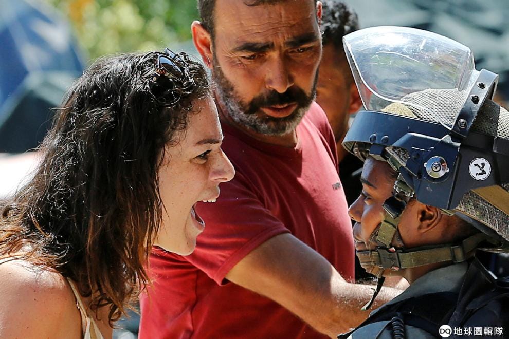 在以色列佔領的約旦河西岸Beit Jala鎮,一名巴勒斯坦女子正在和以色列邊界警察爭辯,不明白為何以色列要拆除原本設有公寓和餐廳的建築。該建築的業主表示,他們被以色列當局通知沒有獲得建築許可,不得已只好拆除。