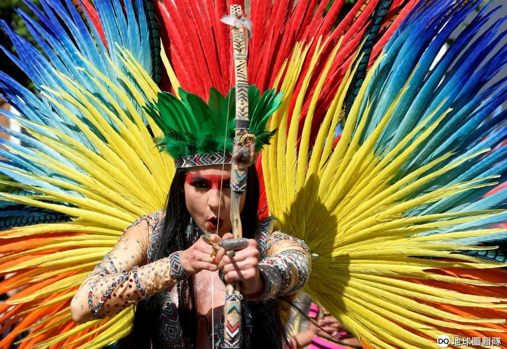在諾丁丘嘉年華(Notting Hill Carnival)上,一名打扮華麗的舞者對著鏡頭拉弓,展現來自祖先的部落文化。
