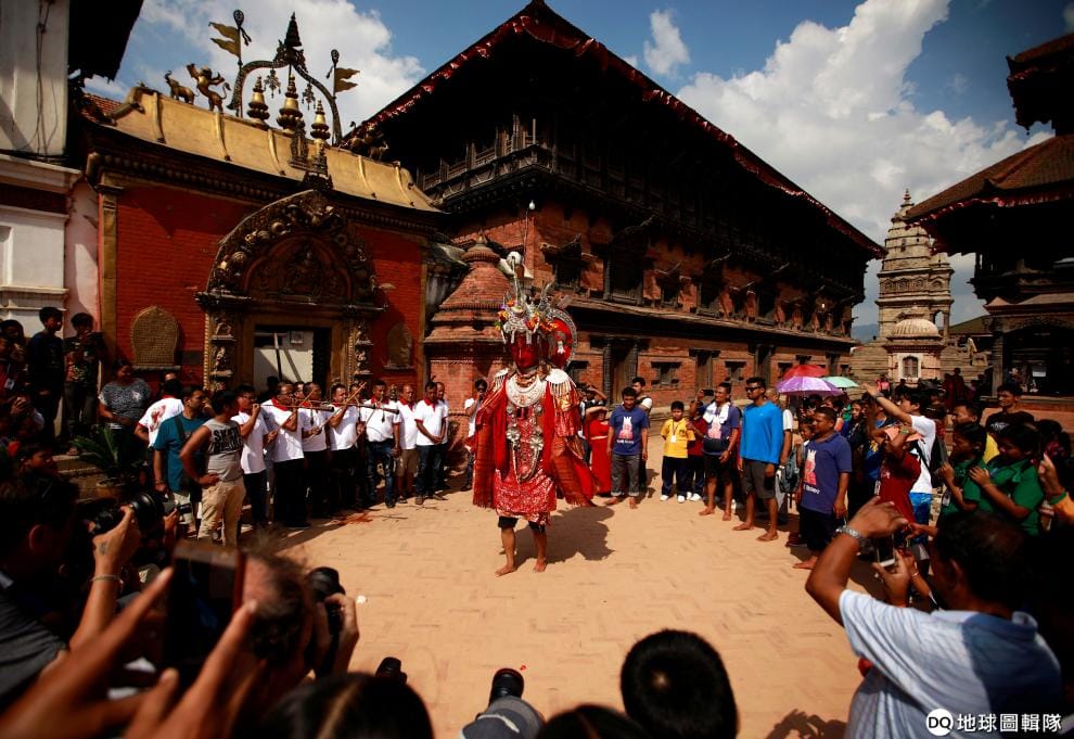 在位於中部的巴克塔普爾鎮(Bhaktapur),一名信徒打扮成神明的模樣,在大街上和民眾一起歡慶夏五禮節(Pancha Dan),這是尼瓦(Newar)佛教的傳統節日,在這一天信徒們要贈送小麥、米、鹽、金錢和水果給僧侶。