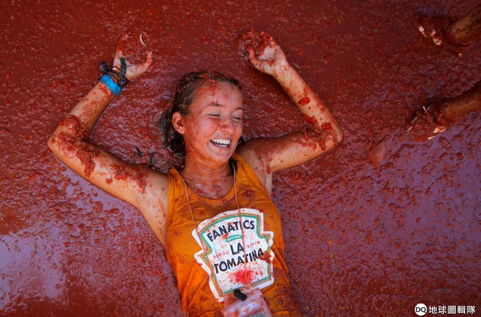 在瓦倫西亞自治區的布尼奧爾鎮(Bunol),一名女子躺在滿滿的番茄泥上。