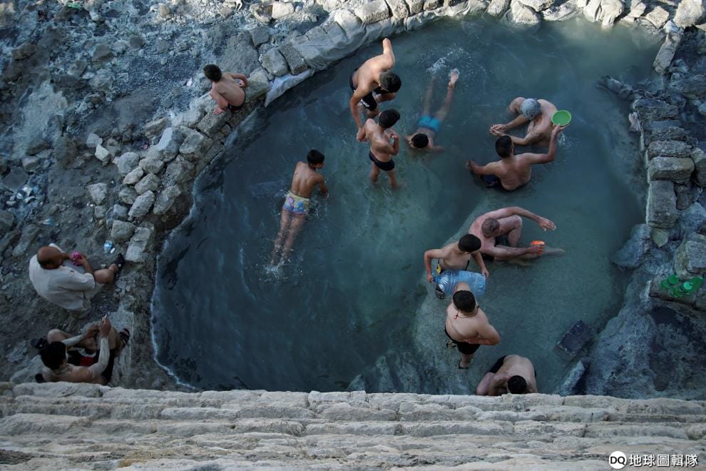 在摩蘇爾城(Mosul)西邊、緊鄰底格里斯河(Tigris river)的石造浴池中,人們正在洗泥巴浴,據說這能治療皮膚疾病。