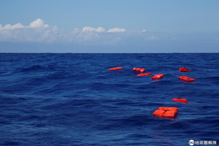 在地中海上,一艘德國NGO移民救援船正在進行救援訓練,可以看到海上漂著數件橘紅色的救生衣。