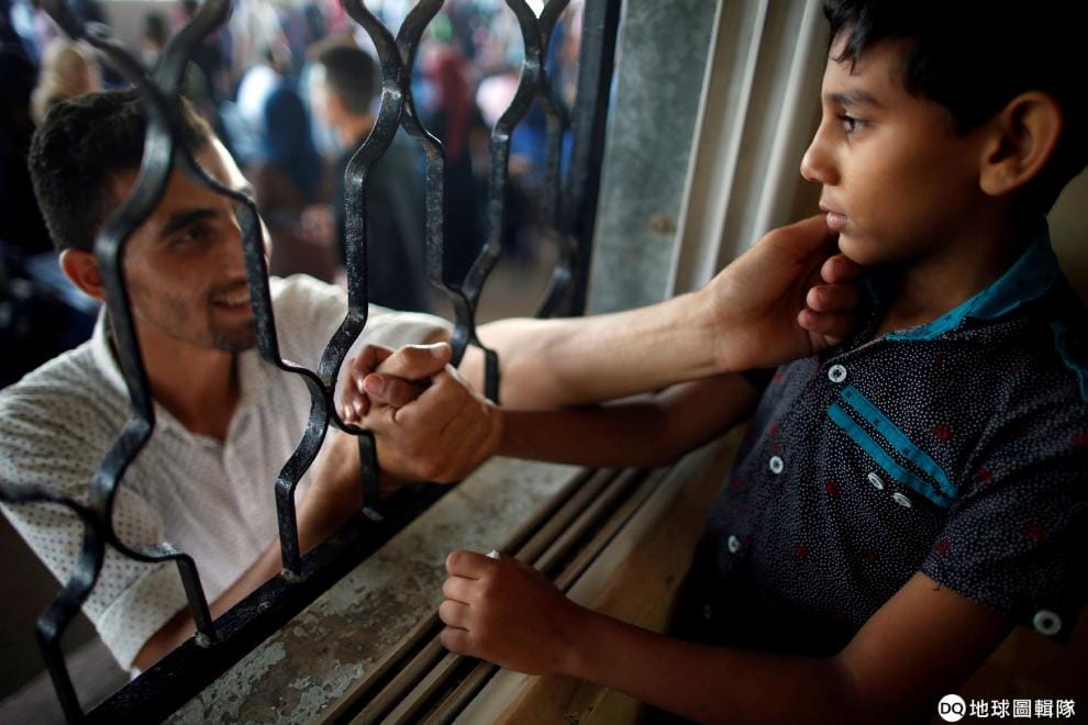 在位於加薩走廊南邊的拉法(Rafah)過境點,一名巴勒斯坦男孩正在跟叔叔道別,他和媽媽即將離開巴勒斯坦。