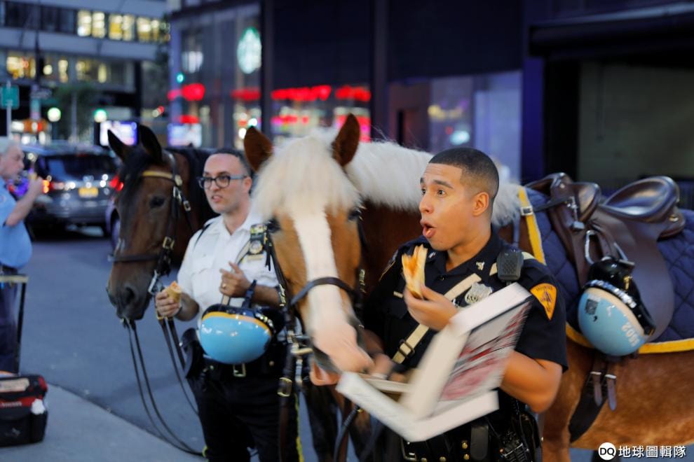 在紐約時代廣場附近,騎警阿吉拉爾(Edwin Aguilar)正在大吃披薩,他的馬索爾(Thor)見狀也湊上來想吃一口。
