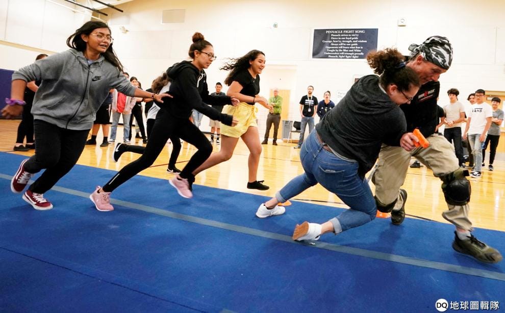 在科羅拉多州的一所中學內,學生們正在演練如何面對槍手闖入校園,以及如何制伏槍手。