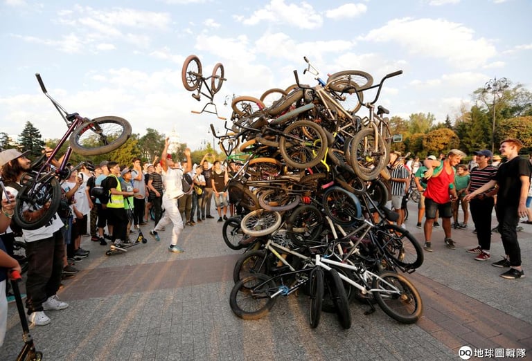 在哈薩克第一大城阿拉木圖(Almaty),剛參加完大型單車活動的民眾,把腳踏車堆成一堆。